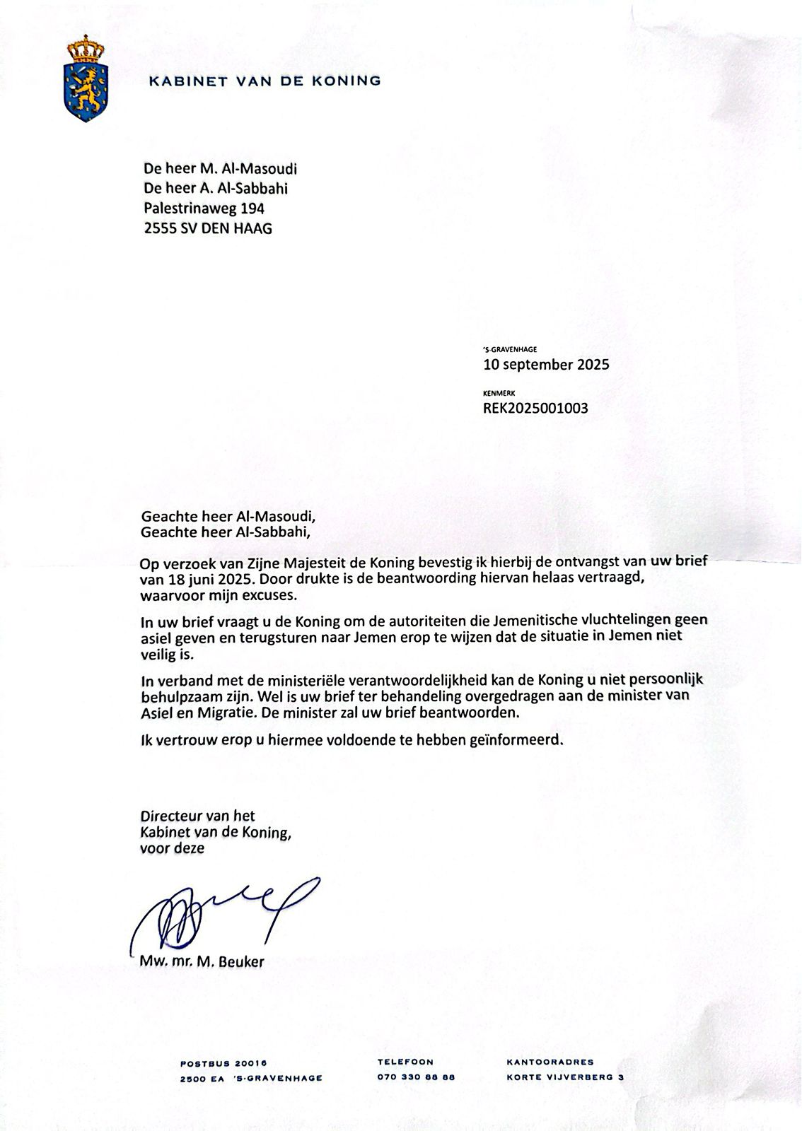تلقى الناشطان اليمنيان الأستاذ محمد المسعودي والدكتور علي الصباحي رداً رسمياً من ديوان الملك الهولندي على رسالتهما المؤرخة في 18 يونيو 2025، والتي طالبا فيها بعدم ترحيل اللاجئين اليمنيين إلى اليمن، والتأكيد على أن الوضع في اليمن غير آمن.