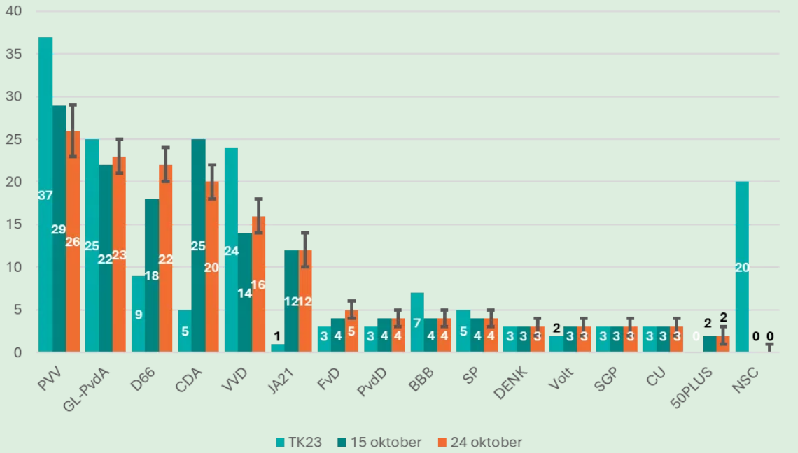 - وفق استطلاع Ipsos/I&O، تصدرت حزب الحرية PVV المرتبة الأولى مع 26 مقعدًا (خسارة 3 مقاعد مقارنة بالأسبوع الماضي)، بينما سجل D66 بقيادة روب ييتن أكبر ارتفاع من 18 إلى 22 مقعدًا، قريبًا جدًا من GL/PvdA التي تحصد 23 مقعدًا.